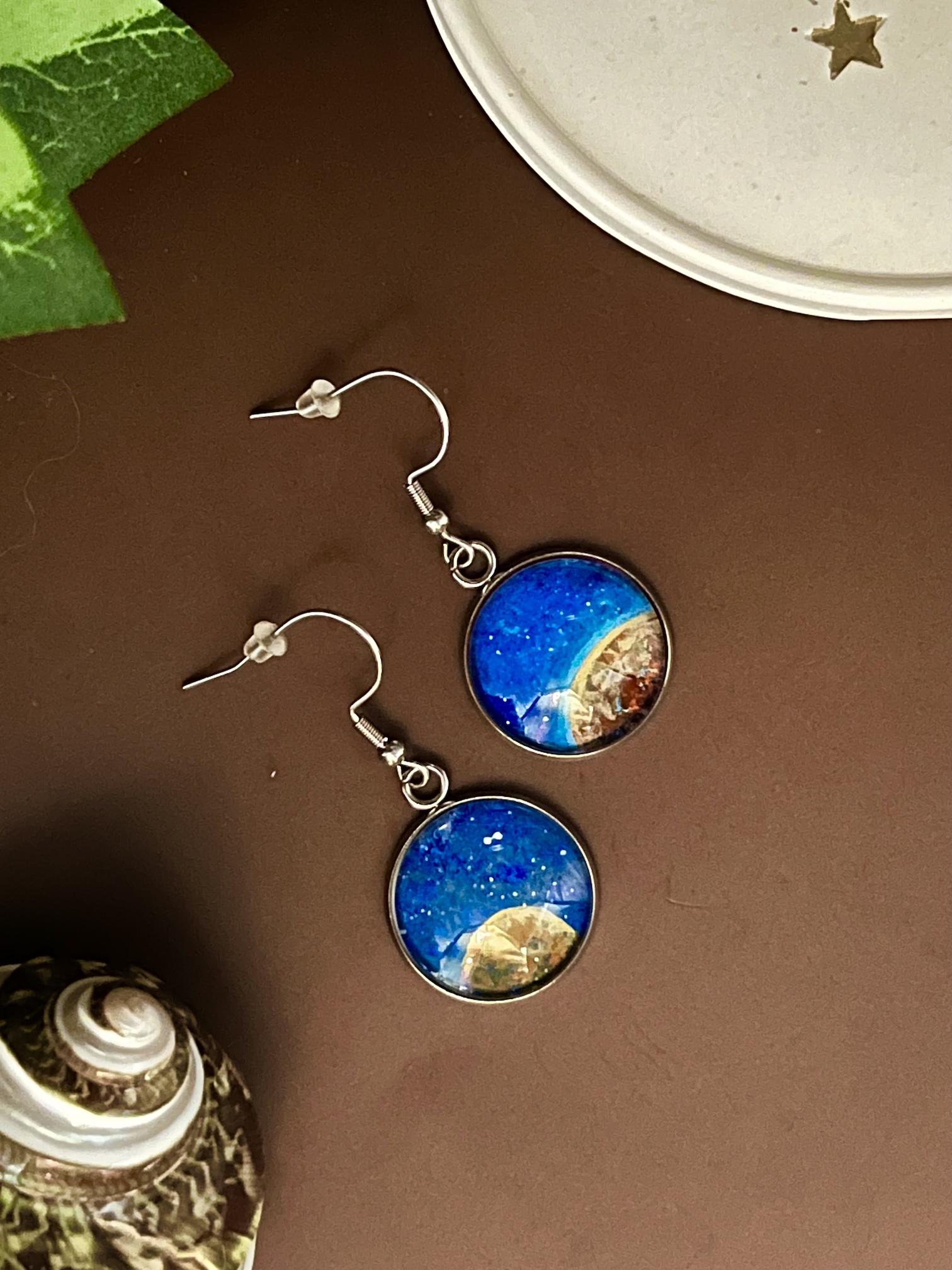 Des boucles d’oreilles assorties, comme deux hublots ouverts sur l’espace, avec une planète à atmosphère et l’autre non. Toutes deux rocheuses, elles apparaissent sur fond de ciel étoilé. Peint à la main tout en minutie sous verre.