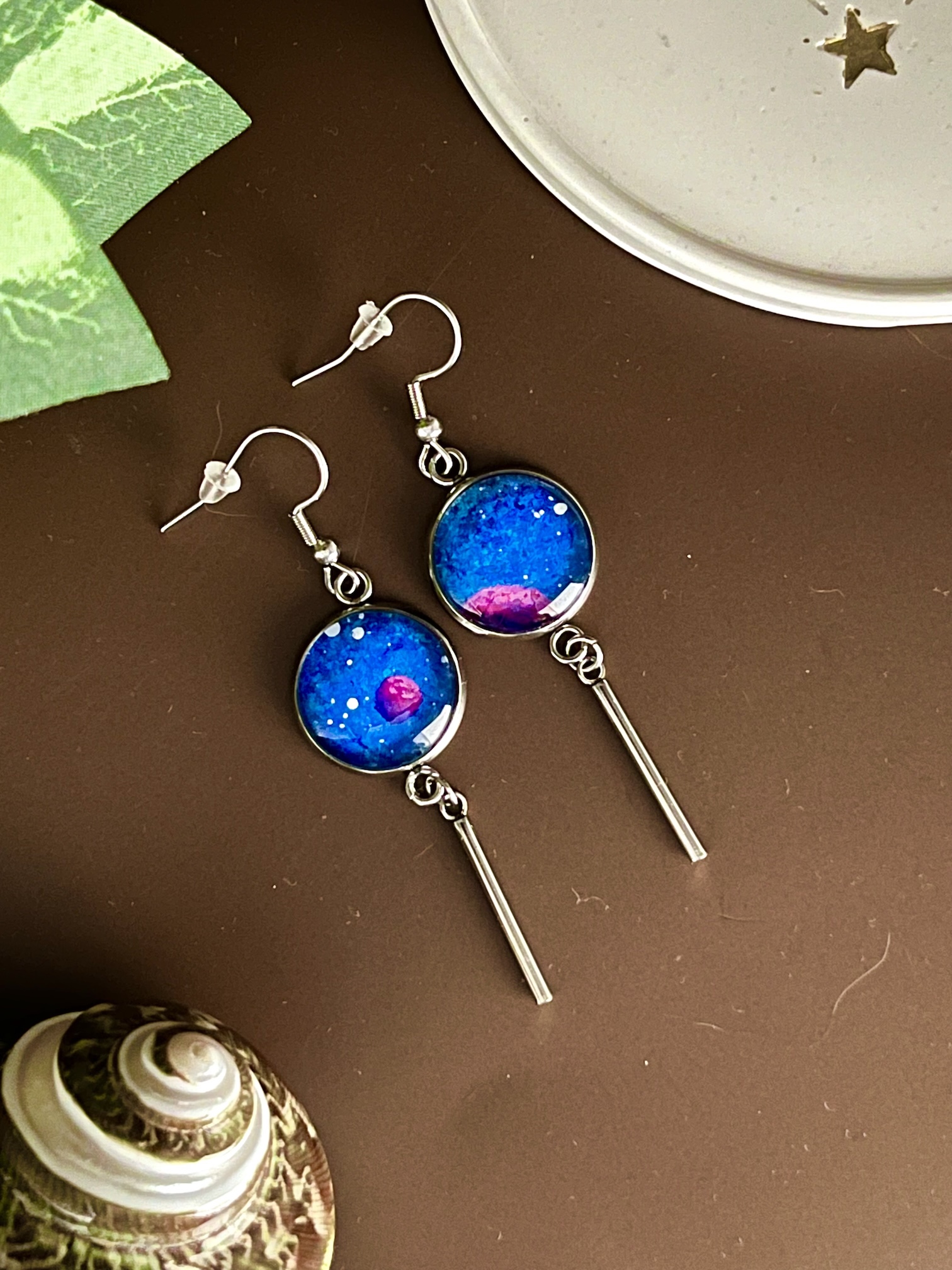Une paire de boucles d’oreilles, comme des hublots ouverts sur l’espace, avec des planètes violettes sur un ciel piqueté d’étoiles. Peint à la main tout en minutie sous verre.