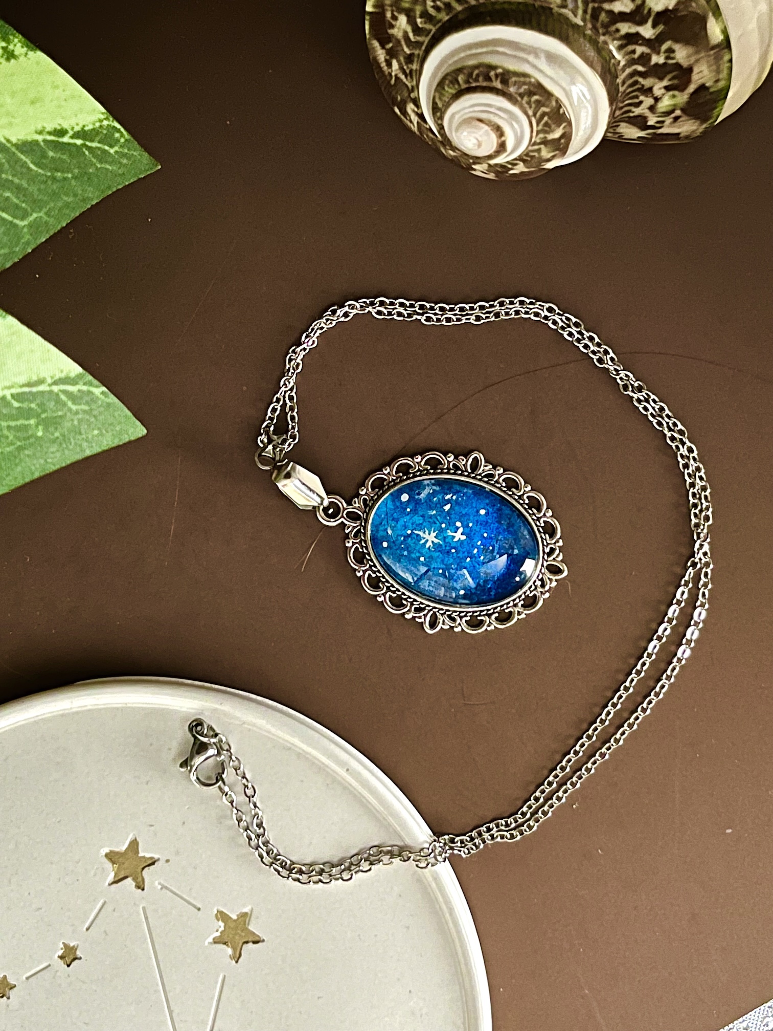 Un pendentif ouvragé et sa chaîne argentée, comme un hublot ouvert sur l’espace, avec un ciel empli d’étoiles. Peint à la main tout en minutie sous verre.