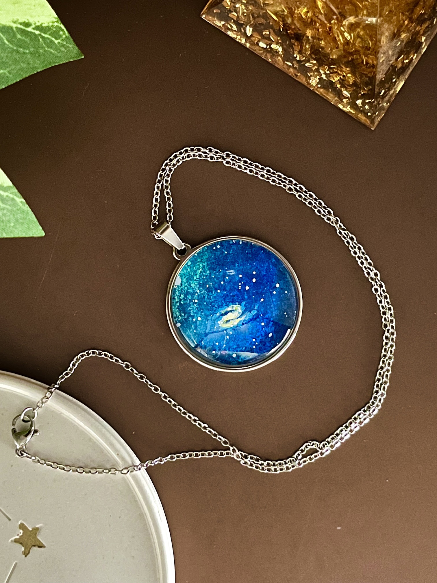 Collier avec galaxie et nébuleuse bleue sur ciel étoilé.
