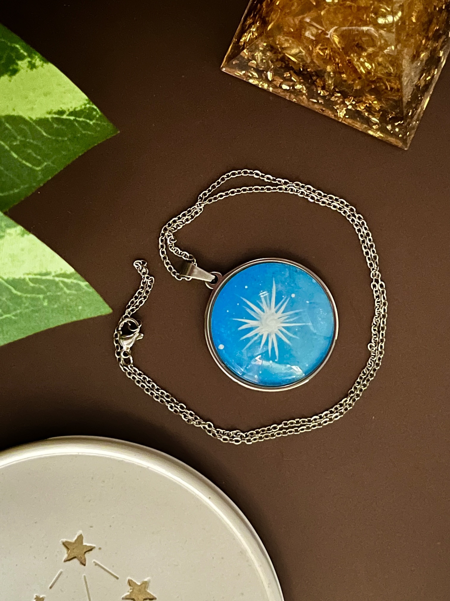 Un pendentif et sa chaîne argentée, comme un hublot ouvert sur l’espace, avec une grande étoile brillante aux multiples brins de lumière, sur ciel bleu clair piqueté d’étoiles. Peint à la main tout en minutie sous verre.