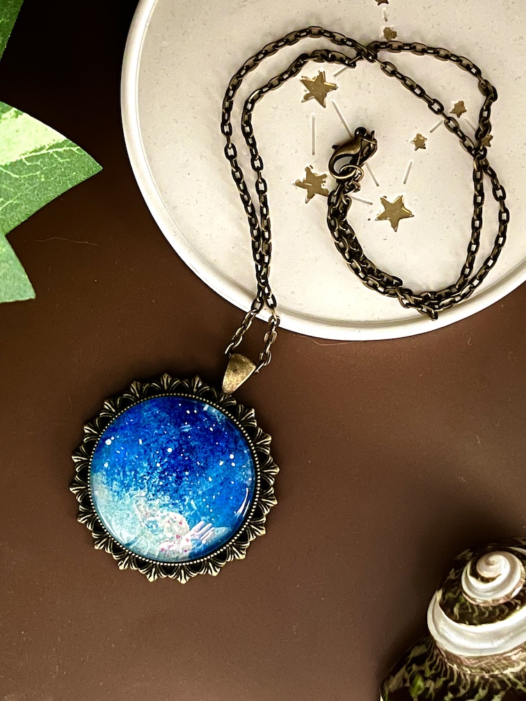 Un pendentif et sa chaîne bronze, comme un hublot ouvert sur l’espace, avec une nébuleuse bleue clair et rose pâle sur fond de ciel piqueté d’étoiles. Peint à la main tout en minutie sous verre.