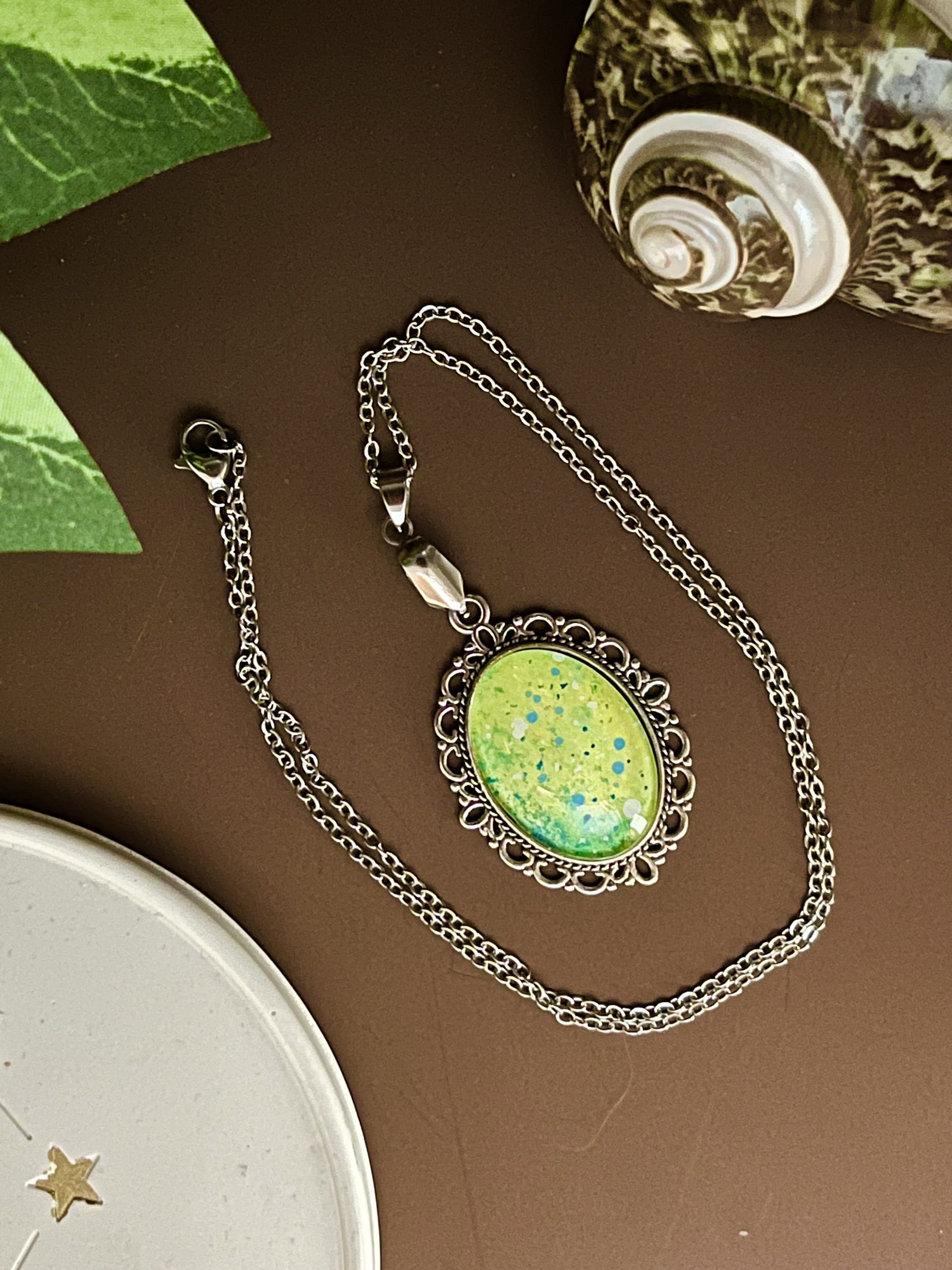 Un pendentif et sa chaîne argentée, comme un hublot ouvert sur l’espace, avec une nébuleuse jaune et verte piquetée d’étoiles blanches , bleues clair et bleues foncé. Peint à la main tout en minutie sous verre.