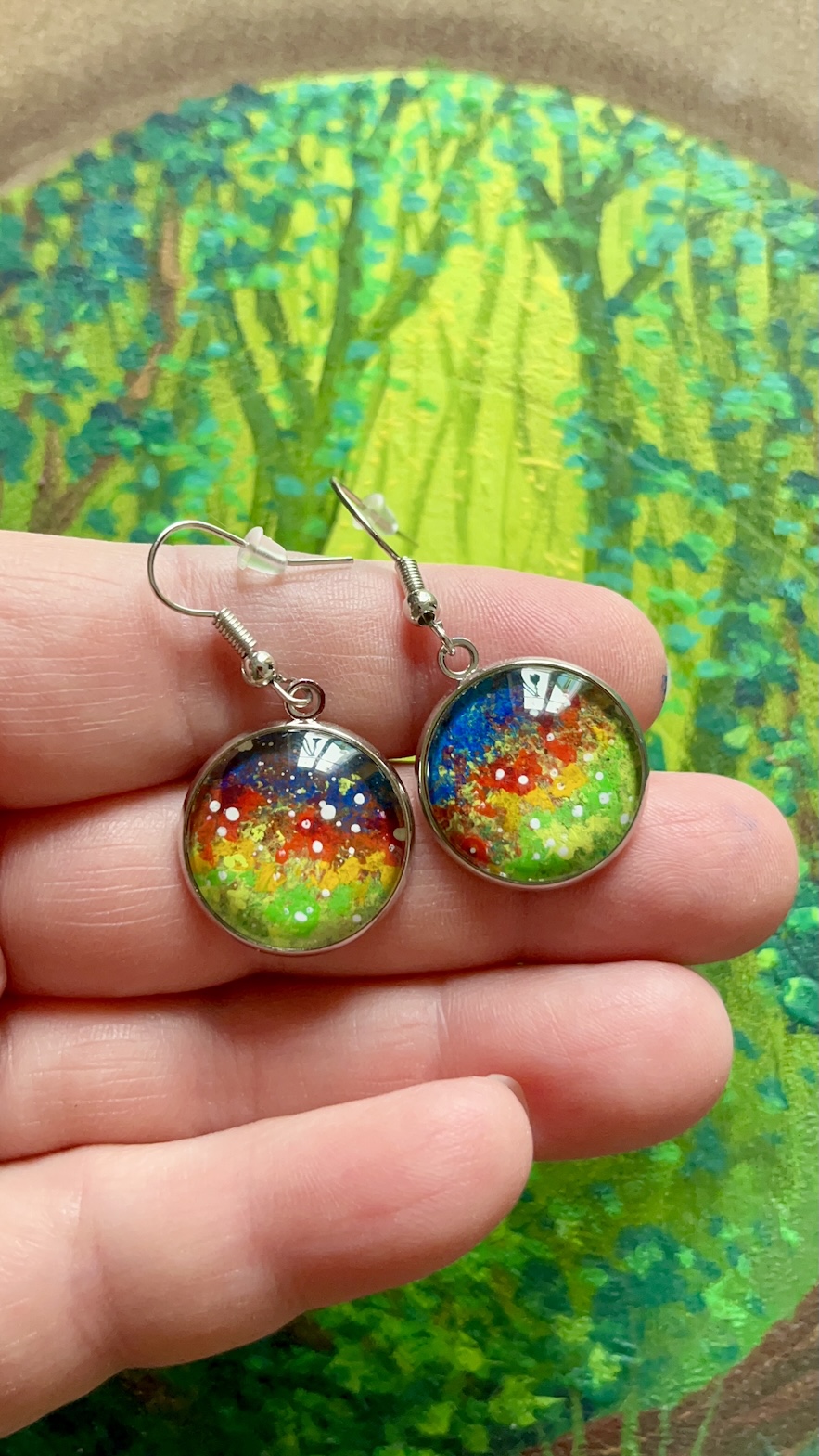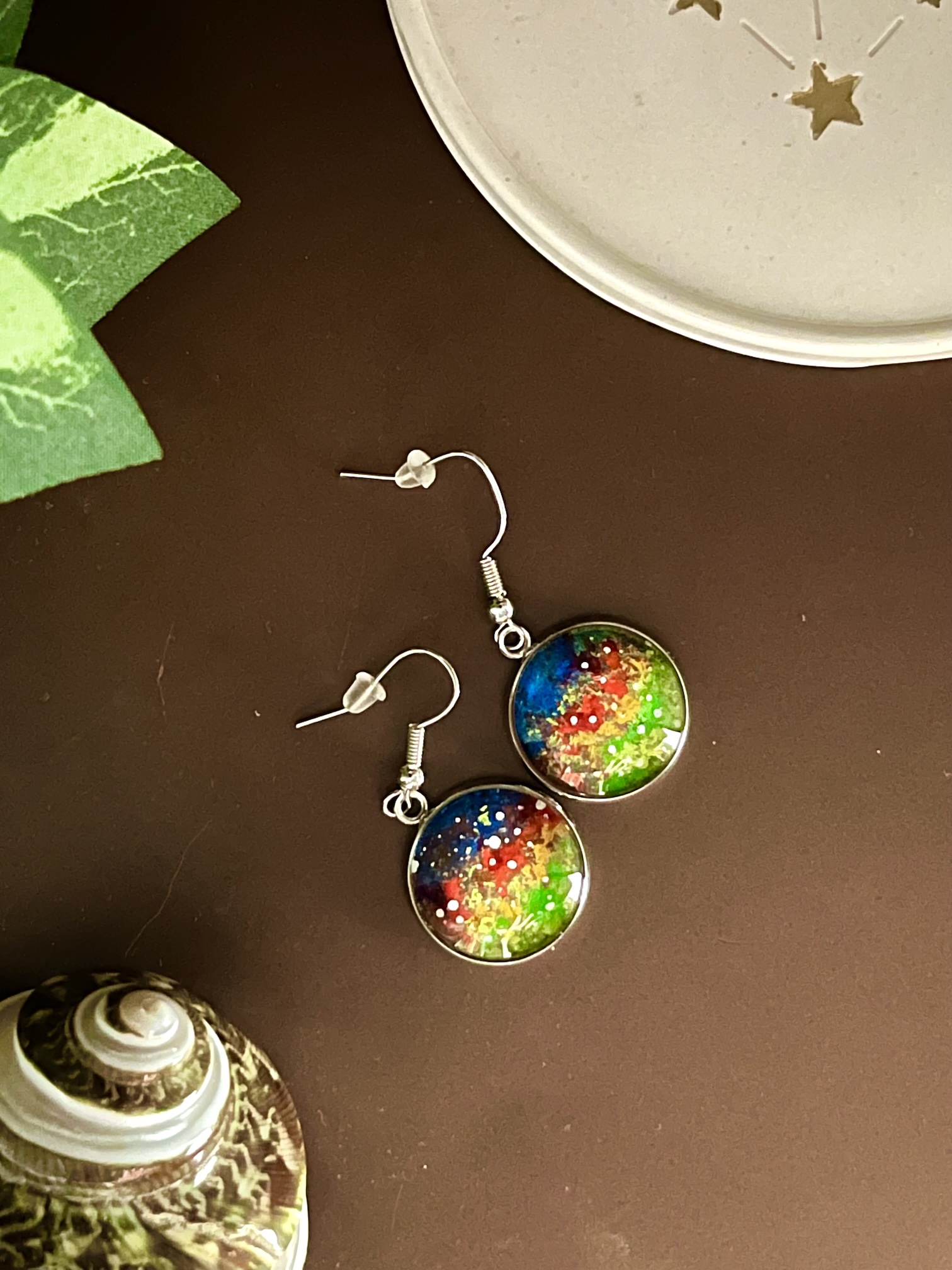 Des boucles d’oreilles assorties, comme deux hublots ouverts sur l’espace, avec de chaque côté une nébuleuse aux couleurs vives. Sur fond de ciel d’un bleu profond, elle se décline en rouge, jaune et vert et piquetée d’étoiles. Peint à la main tout en minutie sous verre.