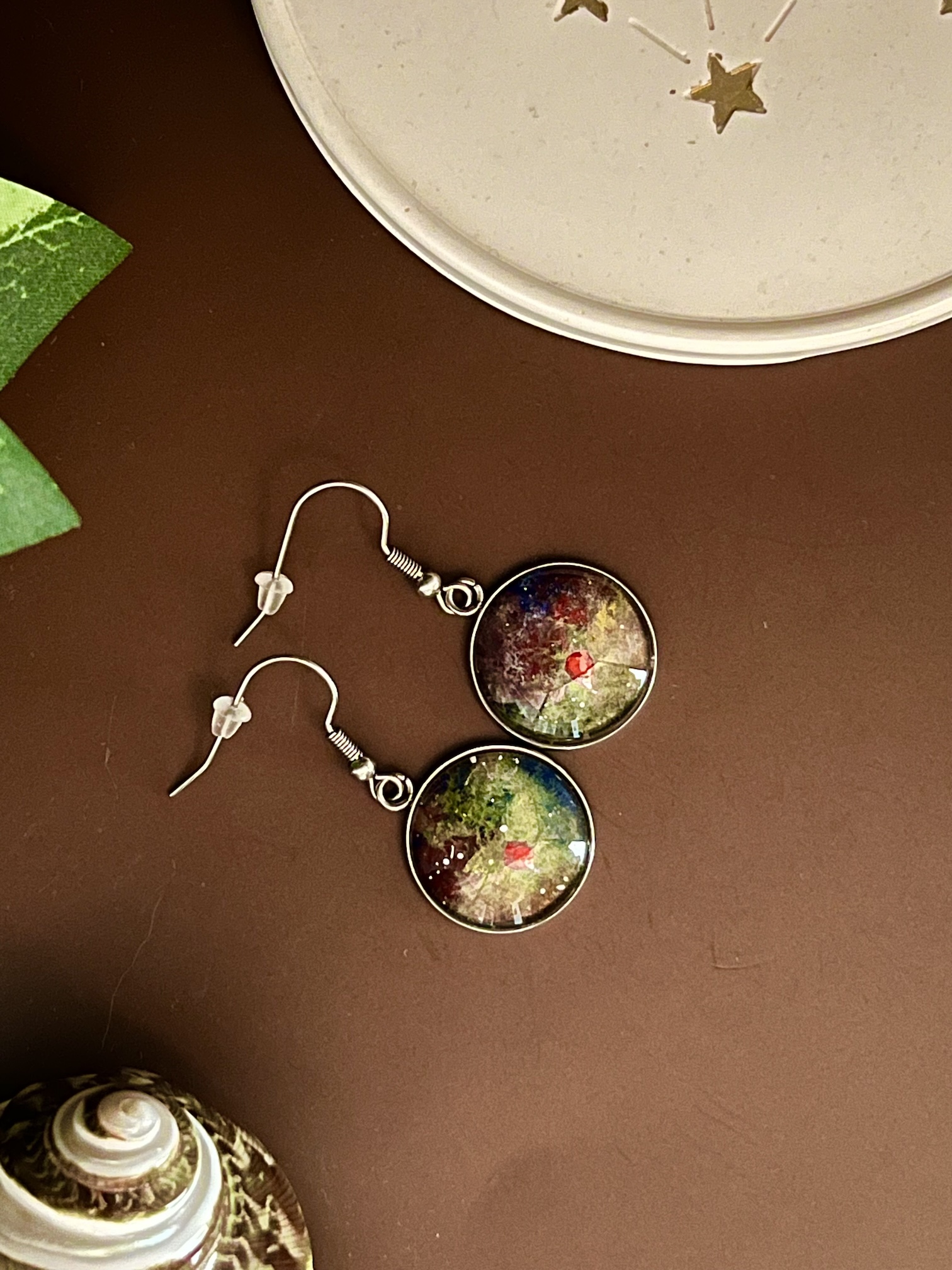 Une paire de boucles d’oreilles, comme des hublots ouverts sur l’espace, avec des planètes roses sur une nébuleuse grise aux reflets moirés. Peint à la main tout en minutie sous verre.